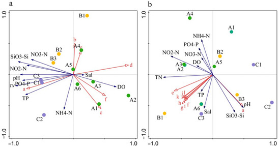 Biplot of phytoplankton dominant species density and environmental factors. a: S. costatum; b: P. sulcata; c: C. jonesiana; d: P. blanda; e: P. pelagicum; f: S. acuminata; g: Alexandrium sp.; h: D. fibula; i: T. muelleri; j: T. furca; k: P. pentagonum; l: D. caudata. Blue arrow: environmental factors; red arrow: dominant species of phytoplankton; solid circle: Station, A1−A6: cultivation area; B: B1–B3: adjacent area; C: C1−C3: control area. Panel (a): April 2018; panel (b): June 2018.