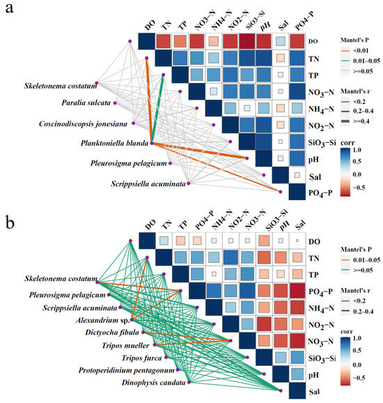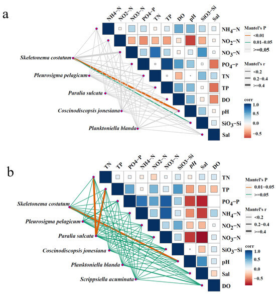 The relationships between dominant phytoplankton species and environmental variables (NH4–N, NO2–N, NO3–N, PO4–P, SiO3–Si, TN, TP, DO, pH, Sal, and T) were analyzed using a pMEN analysis based on Mantel’s tests. The significance of correlations was determined from unadjusted p-values (p < 0.05). Additionally, the pMENs were constructed for dominant species across the four surveys (Figure 6 and Figure 7). Planktoniella blanda was significantly correlated with TN, pH, PO4–P (p < 0.01), and TP (p < 0.05) in April 2018 (Figure 7a). In June 2018, S. costatum was significantly correlated with PO4–P (p < 0.05). A. tamarense showed significant correlations with TN and PO4–P (p < 0.05). Both D. fibula and Tripos muelleri were significantly associated with NO3;–N (p < 0.05) (Figure 7b). In April 2019, S. costatum was significantly correlated with pH (p < 0.01) and SiO3–Si (p < 0.05) (Figure 8a). In June 2019, it remained significantly correlated with pH (p < 0.05). Paralia sulcata showed significant correlations with TN and TP (p < 0.05) (Figure 8b).