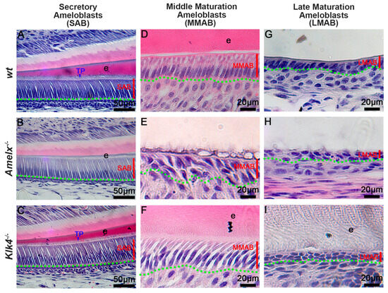 Deficiency in ameloblasts and enamel matrix in Amelx−/− and Klk4−/− mouse incisors revealed through histological analysis. (A) In wild-type (wt) mice, secretory ameloblasts (SABs) were elongated, well-organized, and developed a picket fence-like Tomes’ process (TP) at their apical surface, which is essential for the formation of proteinaceous enamel matrix (e) and aligned hydroxyapatite crystals. (B) In Amelx−/− mice, the Tomes’ process (TP) was poorly developed, and a notably thin enamel matrix layer was detected. (C) No notable morphological changes were observed in SABs and enamel matrix in Klk4−/− mouse incisors. (D) In wt mice, maturation ameloblasts (MABs) are reduced in height and establish a distinct boundary with the underlying papillary layer. (E) In Amelx−/− mouse incisors, MABs organized a multilayered structure, accompanied by a notably thin enamel matrix layer. (F) In Klk4−/− mouse incisors, the morphology of MABs was largely similar to wt controls; however, the enamel matrix (e) exhibited elevated protein retention and expanded intercellular spaces between cells. (G) The late stage of wt MABs was markedly reduced in height, transitioning into low columnar epithelial cells that fused with the underlying papillary layer cells. Proteins were not detectable in the decalcified enamel matrix. (H) At later stages, MABs in Amelx−/− mouse incisors became depolarized, flattened in morphology, and formed a multilayered structure. (I) In the late stage, MABs in Klk4−/− mouse incisors were depolarized, and proteins were detectable in the enamel matrix (e).