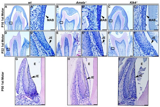 The morphology of junctional epithelial cells in Amelx−/− and Klk4−/− mouse molars differs from that of wt junctional epithelial cells. The developmental trajectory of ameloblasts and the enamel matrix has been thoroughly characterized in mouse molars [34]. At postnatal day 16 (P16), the first molars in mice were poised for tooth crown eruption. At this stage, ameloblasts fused with the papillary layer, forming squamous, multilayered epithelial cells that began interacting with the oral mucosal epithelium in the oral cavity (see Figure 2A–C). At higher magnification, ameloblasts in the molars displayed phenotypes consistent with those observed in mouse incisors: late-stage Amelx−/− ameloblasts appeared less organized and thinner, while Klk4−/− molar ameloblasts showed increased intercellular spacing and interacted with retained enamel matrix proteins (see Figure 2A’–C’).