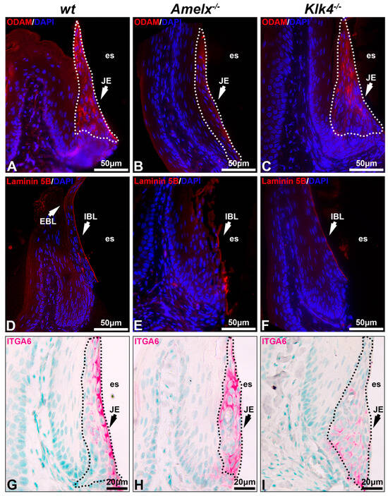 The interaction between junctional epithelial cells and internal basal lamina is impaired in the gingiva of Amelx−/− and Klk4−/− mice. Junctional epithelial cells secrete molecules that form the dense network of internal basal membrane, mediating gingival attachment to the enamel surface, sealing the gingival pocket, and preventing bacterial invasion [2,3]. We investigated the impacts of amelogenin or KLK4 loss-of-function on junctional epithelial cell functions by analyzing two key basal lamina proteins, ODAM and laminin 5B, as well as integrin alpha 6 (ITGA6), the cell surface receptor for laminin 5B [37]. In the wt mouse gingiva, ODAM was detected in junctional epithelial cells and adjacent internal basal lamina (IBL) (see Figure 3A), laminin 5B was predominantly present in the internal basal lamina and visible on the external basal lamina (EBL) (see Figure 3D), and ITGA6 was well organized on the junctional epithelial cell membrane, with a strong concentration at their apical surface (see Figure 3G). Junctional epithelial cells in Amelx−/− mice exhibited reduced ODAM level (see Figure 3B). Laminin 5B and ITGA6 were less densely distributed and less concentrated along the apical side of the junctional epithelium (see Figure 3E,H). In Klk4−/− mice, ODAM was barely deposited along the apical side of the gingiva (see Figure 3C), whereas laminin 5B was present along the apical surface of the junctional epithelium, albeit in reduced abundance (see Figure 3F). ITGA6-positive immunostaining was observed across all layers of the junctional epithelial cells (see Figure 3I). No EBL was detectable in Amelx−/− and Klk4−/− mouse gingiva. These findings indicate that proper ameloblast differentiation is crucial for junctional epithelial cells to form the internal basal lamina, which anchors the gingiva to the enamel surface.