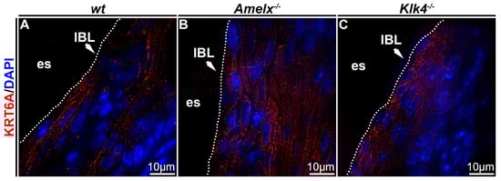 Immunostaining images illustrate the distribution of cytokeratin KRT6A in the junctional epithelium of wt, Amelx−/− and Klk4−/− mouse gingiva. The distribution of KRT6A (in red) in wt junctional epithelial cells was organized in the cytosol, aligning with the long axis of cells at the apical region of the junctional epithelium (A). The KRT6A meshwork in irregularly shaped Amelx−/− junctional epithelial cells was markedly disorganized (B). The KRT6A distribution pattern in Klk4−/− junctional epithelial cells was less uniform compared to that in wt cells (C).