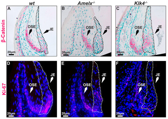 The replenishing ability of the junctional epithelial cells in Amelx−/− and Klk4−/− mouse gingiva was reduced. The capacity of epithelial cells to self-renew is vital for maintaining tissue homeostasis, particularly in regions subject to ongoing constant wear and tear [41]. Epithelial tissues, including the junctional epithelium, depend on ongoing renewal to preserve their structural integrity and functionality. Previous research highlights the Wnt/β-catenin signaling pathway as essential for cell proliferation and migration, facilitating the self-renewal of junctional epithelial cells [42,43]. Therefore, we examined the distribution pattern of β-catenin and Ki67 in the junctional epithelium to understand the mitotic dynamics in Amelx−/− and Klk4−/− mouse gingiva. Ki67 is recognized as a biomarker of cell proliferation [44,45]. Notably, we observed that β-catenin and Ki67 positive immunostaining signals were co-localized at the base of the junctional epithelium and oral sulcular epithelium (OSE). However, the signal intensity at the base of the OSE was consistent across all three mouse models, suggesting that the loss-of-function of amelogenin and KLK4 did not affect the dynamics of OSE. Within the junctional epithelium in wt gingiva, β-catenin and Ki67 exhibited a polarized distribution, extending from the base toward the apical and coronal regions (see Figure 5A,D). In the junctional epithelium of Amelx−/− and Klk4−/− mouse gingiva, β-catenin did not exhibit the polarized distribution pattern that occurred in wt controls (see Figure 5B,C). In particular, the localization of β-catenin-positive cells within the junctional epithelial tissue in the gingiva of Klk4−/− mice is less detectable apically compared to wild-type (wt) and Amelx−/− mice. Fewer Ki67-labeled proliferating cells were observed at the base of the junctional epithelium in Amelx−/− and Klk4−/− mouse gingiva (see Figure 5C,F).