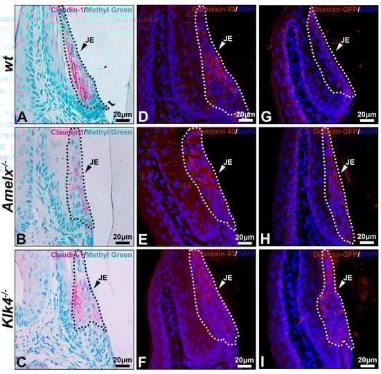 Immunostaining images illustrate the distribution of claudin-1, connexin 43, and dextran-GFP in the junctional epithelium of wt, Amelx−/− and Klk4−/− mouse gingiva. The junctional epithelium (JE) was enclosed by dashed lines. Compared to wt (A), the immunostaining signal of claudin 1 was reduced in Amelx−/− junctional epithelium (B) and was shifted toward the apical portion in Klk4−/− junctional epithelium (C). The immunostaining signal of connexin 43 was primarily localized in the central portion of the wt junctional epithelium (D), became more dispersed in Amelx−/− junctional epithelium (E), and shifted toward the coronal portion in Klk4−/− junctional epithelium (F). A limited amount of Dextran-GFP was immunostained beneath the surface of wt junctional epithelium (G), while an increased amount of Dextran-GFP was detected in the Amelx−/− and Klk4−/− junctional epithelium (H,I).