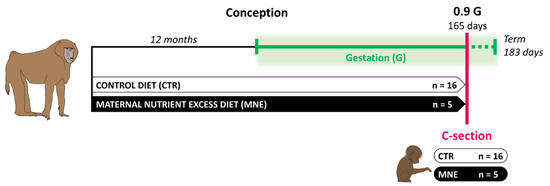 All animal procedures were approved by the Texas Biomedical Research Institute (TBRI) Institutional Animal Care and Use Committee (protocol number 1675 PC) and conducted in Association for Assessment and Accreditation of Laboratory Animal Care international-approved facilities. The experimental design adhered to the ARRIVE guidelines and incorporated the principles of the 3Rs [27]. Animals were housed in group cages with a floor area of 37 m2 and 3.5 m in height. Groups of up to 16 non-pregnant, outbred female baboons (Papio spp.) were initially housed with a vasectomized male in outdoor gang cages to promote social stability, facilitate natural social behaviors, and ensure unrestricted physical activity. Details of the housing structure and environmental enrichment have been previously published [28]. Maternal morphometric measurements were performed before pregnancy to ensure weight homogeneity and general morphometrics in females randomly assigned to the two groups, as described elsewhere [29]. Nulliparous female baboons of similar age and body weight (10–15 kg) were either assigned to the control (CTR) or maternal nutrient-excess (MNE) group. Females in the CTR group (n = 16) were fed normal chow, the Purina Monkey Diet 5038 (Purina LabDiets, St. Louis, MO, USA), containing stabilized vitamin C and all required vitamins. MNE females (n = 5) had ad libitum access to the same diet as the CTR group and additional ad libitum access to the Purina 5045-6 (Purina LabDiets, St. Louis, MO, USA) high-fat and high-energy diet, as well as free access to fructose sodas [28]. This diet was consumed for at least 12 months before pregnancy to increase body fat (Figure 1). The composition of each diet, along with the basic composition of the biscuit, is presented in Table 1. Of note, the content of protein and essential minerals and vitamins required for the baboon was matched for both CTR and MNE diets. Twelve months after the nutritional intervention, a fertile male was introduced into the group cages. Male baboons used for breeding were maintained on standard chow and were not subjected to any dietary intervention. Female baboons were monitored twice daily for general well-being and three times per week for perineal turgescence and vaginal bleeding to determine the time of conception. Pregnancy was dated initially by the changes in swelling of the sex skin and confirmed at 30 days of gestation by ultrasonography. Only singleton pregnancies were studied.