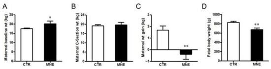 Body weight of mothers subjected to a control (CTR) or maternal nutrient-excess (MNE) diet, and respective fetuses developed in these different maternal conditions. (A) Maternal body weight at conception (baseline). (B) Maternal body weight at cesarean section (90% of the gestation). (C) Maternal weight gain during pregnancy. (D) Fetal body weight at cesarean section. CTR: open, n = 16; MNE: closed, n = 5. Data are expressed as mean ± SEM. ** p < 0.01, * p < 0.05.