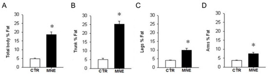 Maternal fat percentage from DEXA scan evaluation after 12 months on the control (CTR) or maternal nutrient-excess (MNE) diet, before conception. (A) Total body fat percentage. Fat percentage in the (B) trunk, (C) legs, and (D) arms. CTR: white, n = 7; MNE: black, n = 5. Data are expressed as mean ± SEM; * p < 0.05.