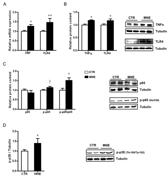 In light of the characteristic low-grade inflammation associated with obesity, we evaluated the effects of maternal obesity at conception and the MNE diet before and during pregnancy on markers related to inflammation and stress signals within the fetal soleus muscle. The transcript levels of TNF and TLR4 were increased in the soleus muscle of MNE fetuses (p < 0.05 and p < 0.01, respectively, Figure 4A). A higher WB band density of the proteins encoded by these genes was also observed (p < 0.05, Figure 4B). Moreover, the MNE diet contributed to an increased ratio between the phosphorylated form of the NF-kB subunit p65 (Ser536) to total p65 protein content (p-p65/p65, p < 0.05, Figure 4C), suggesting the activation of the NF-kB pro-inflammatory pathway in the soleus muscle. A pro-inflammatory environment is further suggested by the observed activation of the p38 MAPK canonical pathway by higher levels of the phosphorylated form of p38 (Thr180/Tyr182) in fetal soleus muscle (p-p38, p < 0.05, Figure 4D). Pro-inflammatory signaling is usually associated with altered mitochondria function in several tissues, particularly in the context of chronic diseases, disrupting mitochondrial homeostasis and oxidative capacity [23,24]. Therefore, we next addressed how maternal obesity at conception induced by an MNE diet maintained during pregnancy affected fetal soleus muscle mitochondria quality control.