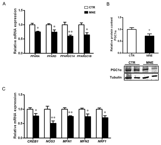 The peroxisome proliferator-activated receptors (PPAR) family plays a crucial role in cellular energy homeostasis regulation and metabolic function. In skeletal muscle, PPARs are highly involved in energy utilization and substrate preference but also play a role in inflammation. The relative mRNA levels of PPARA PPARD were decreased in the MNE fetal soleus muscle (p < 0.05, Figure 5A). Lower levels of the transcriptional co-activators of the PPARγ co-activator family, PPARGC1A and PPARGC1B, known as the “master regulators” of mitochondrial biogenesis, were also observed (p < 0.01 and p < 0.05, respectively, Figure 5A). This was accompanied by decreased cAMP responsive element binding protein 1 (CREB1) and endothelial nitric oxide synthase (NOS3 transcript levels (p < 0.05, Figure 5C). CREB1 and NO levels, the latter partly regulated by eNOS, are highly involved in cellular signaling, contributing to the transcriptional induction of PGC1α, thus promoting mitochondrial biogenesis [33]. The protein levels of PGC1α were also found to be decreased in the MNE fetal soleus muscle (p < 0.05, Figure 5B). Furthermore, the transcript levels of nuclear respiratory factor 1 (NRF1), a crucial factor for the transcription of nuclear-encoded mitochondrial genes and whose expression is induced by PGC1α, were also lower in the soleus muscle of MNE fetuses (p < 0.05, Figure 5C).