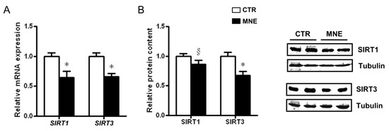 Sirtuins are deacetylases involved in the regulation of various cellular processes, including those related to mitochondrial function, biological responses to stress, metabolism modulation, and development. Sirtuins also play a protective role in several chronic diseases due to their distinct ability to regulate autophagy. While SIRT1 has a diverse subcellular localization pattern, SIRT3 is primarily localized in mitochondria [34,35]. In this study, SIRT1 and SIRT3 transcript levels were both lower in the soleus muscle of MNE fetuses (p < 0.05, Figure 6A) and while only a decreasing trend was observed for SIRT1 protein levels (Figure 6B), SIRT3 levels were lower in MNE fetal soleus muscle (p < 0.05, Figure 6B), with possible implications for mitochondrial oxidative capacity and function regulation.