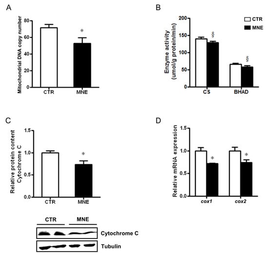 Diverse parameters can be used to assess mitochondrial health in frozen tissues. In this work, we determined mitochondrial DNA copy number, often used as a direct indicator of mitochondrial content. In the soleus muscle of MNE fetuses, mtDNA copy number was decreased compared to the levels observed in CTR fetuses (p < 0.05, Figure 7A). Alterations in transcripts and protein levels can often manifest as alterations in enzymatic activities. Citrate synthase’s (CS) activity, commonly used as a marker to assess mitochondrial content, showed a decreasing trend in the soleus muscle of MNE fetuses (Figure 7B). A similar trend was observed in the activity of a key mitochondrial enzyme involved in the third reaction of β-oxidation, the β-hydroxyacyl-CoA dehydrogenase (BHAD, Figure 7B). Elements of the mitochondrial electron transport chain (ETC) might also be subject to dysregulation due to chronic disease. In the fetuses of MNE mothers, the protein expression of cytochrome C was lower (p < 0.05, Figure 7C). Cytochrome C is an ETC essential component that transfers electrons between ubiquinol cytochrome C oxidoreductase (Complex III) and cytochrome C oxidase (Complex IV), the latter being the terminal enzyme of the mitochondrial respiratory chain, as it catalyzes the electron transfer from reduced cytochrome C to molecular oxygen. Three mitochondrial DNA-encoded subunits compose the cytochrome C oxidase catalytic core (COX I, COX II, and COX III). The transcript levels of the Icox1 and cox2 subunits were decreased in the soleus skeletal muscle of MNE fetuses (p < 0.05, Figure 7D). All in all, these data suggest impaired mitochondrial function in the soleus muscle of fetuses from mothers obese at conception and fed an MNE diet throughout pregnancy.