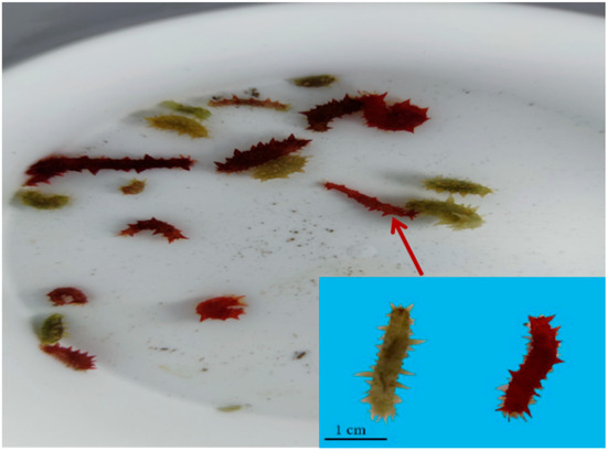 During research, exploring the ecological seedling breeding technology of A. japonicus, we found that some individuals turned red during the development stage to juvenile sea cucumber (Figure 1). Compared with the traditional completely dark culture conditions, exposure to light intensity was 2000–3000 Lx, which resulted in red juvenile sea cucumbers, with a color change rate reaching 95%. The preliminary observations revealed a growth advantage in the red morph compared to the green morph.
