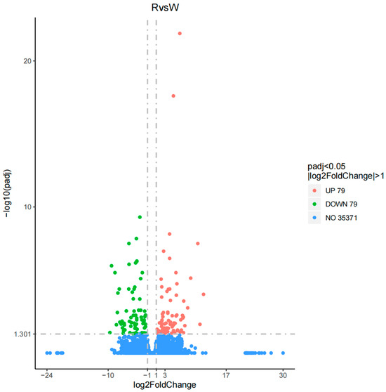 The DEGseq software package was used to analyze the differential expression of genes in the body wall of red and green A. japonicus with |log2(fold change)| ≥ 1 and p ≤ 005. A total of 158 DEGs were detected in the experimental versus control (R vs. W) comparisons; 79 DEGs were upregulated and 79 DEGs were downregulated (Figure 2).