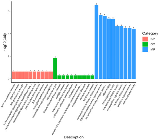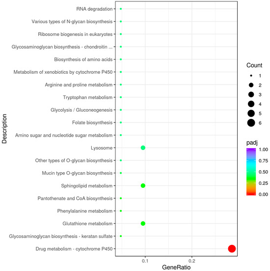 The GO functional enrichment analysis of the DEGs showed that DEGs were annotated with 177 GO terms that were classified into 30 subcategories under the 3 main GO categories of biological process (BP), cellular component (CC), and molecular function (MF) (Figure 3). In the R vs. W comparison, pyruvate metabolic process, glycolytic process, and purine nucleoside diphosphate metabolic process were significantly enriched under BP (p < 0.05); the extracellular region was significantly enriched under CC (p < 0.05); and serine-type endopeptidase inhibitor activity, NADP binding, and N-dimethylaniline monooxygenase activity were significantly enriched under MF (p < 0.05). The KEGG pathway enrichment analysis of the DEGs showed that 34 DEGs were associated with 26 pathways, with drug metabolism-cytochrome P450 (5 upregulated and 1 downregulated DEGs) being the most significantly enriched (Figure 4).