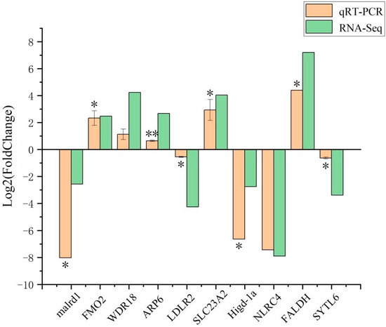 To verify the correctness of the mRNA library, 10 differentially expressed genes (DEGs) were randomly selected from the mRNA library for verification. Roche LightCycler96 was used to perform qRT-PCR on randomly selected differential genes in the transcriptome library [17]. The primers used for quantification are shown in Table 1. The −2−ΔΔCt method was used to calculate the relative expression of DEGs [18].