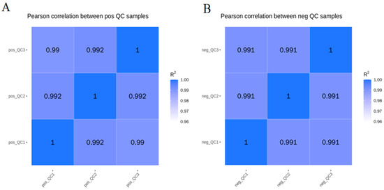 Pearson correlation of QC samples, (A) is positive ion mode, (B) is negative ion mode, and R2 is the coefficient of determination.