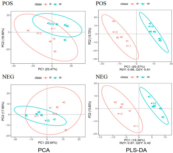 PCA and PLS-DA analysis of the body wall of red and green A. japonicus, POS stands for positive ion mode (up), and NEG stands for negative ion mode (down).