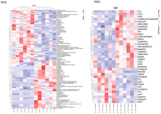 SDM clustering thermogram of the body wall of red and green A. japonicus, POS stands for positive ion mode (left) and NEG stands for negative ion mode (right).
