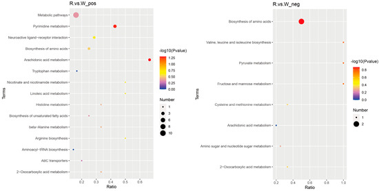 Bubble diagram of KEGG enrichment of different metabolites in the body wall of red and green A. japonicus, POS stands for positive ion mode (left) and NEG stands for negative ion mode (right).