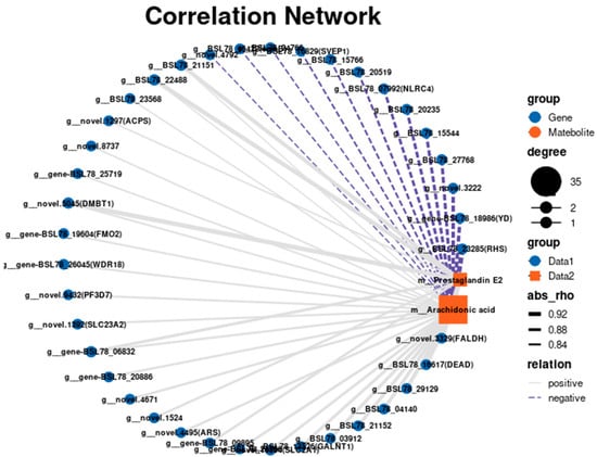 To further explore the association between metabolites and genes in the R vs. W comparison, we performed a joint transcriptomic and metabolomic analysis. We found that arachidonic acid metabolism was a significantly enriched KEGG pathway. The interaction network diagram between two metabolites and genes in the arachidonic acid metabolic pathway was visualized based on the analysis results (Figure 10). A correlation coefficient p-value < 0.05 was considered to be significant. A Pearson coefficient < 0 is considered a negative correlation and >0 is considered a positive correlation. The differentially abundant metabolite arachidonic acid was associated with 35 key DEGs; 22 were positively correlated and 13 were negatively correlated. The differentially abundant metabolite prostaglandin E2 was associated with eight key DEGs, all of which were positively correlated.