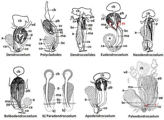 The morphological types corresponding to the supraspecific taxa Dendrocoelum s.str., Polycladodes, Dendrocoelides, Eudendrocoelum, Neodendrocoelum, Bolbodendrocoelum, Apodendrocoelum (adapted from Gourbault 1972 [2] (p. 43, Figure 7)), Paradendrocoelum (adapted from Kenk 1930 [38] (p. 56, Figure 2)), and Palaeodendrocoelum (adapted from Codreanu 1950 [17] (p. 611, Figure 3, scale bar 0.1 mm). Abbreviations: a—adenodactyl; bc—bursal canal; ca—common atrium; cb—copulatory bursa; co—common oviduct; ej—ejaculatory duct; f—flagellum; m—supplementary muscular circular layer at the base of the penis bulb; ma—male atrium; p—penis; pb—penis bulb; pp—penis papilla; sv—seminal vesicle; vd—vas deferens.