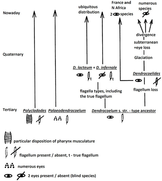 (1) One evolutionary pattern (Figure 3) may consider three groups (taxa) of ancient origin: Polycladodes and Paleodendrocoelum (of Tertiary origin), and a Dendrocoelum-type ancestor (of unknown geological origin), which is bi-occulated and has a penial flagellum of an unknown type. The evolution of the latter Dendrocoelum-type ancestor may have followed two main directions: