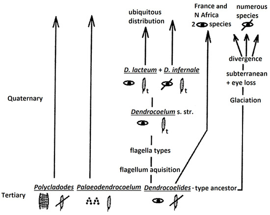 (1) (b) A loss of the flagellum, a characteristic typical of Dendrocoelides. This type of ancestor (of pre-Quaternary age) underwent Glaciation (see pages 8–9 of this paper, point (2) (B)). Attenuated Glaciation in some areas (S Europe and N Africa) determined the survival of two ocellated species in France and N Africa, which represent a margin of an ancient geographical range. Other Dendrocoelides species disappeared, and others migrated into the subterranean, where they lost their eyes and underwent diversification, resulting in numerous endemic species that are distinct at the level of genitalia.