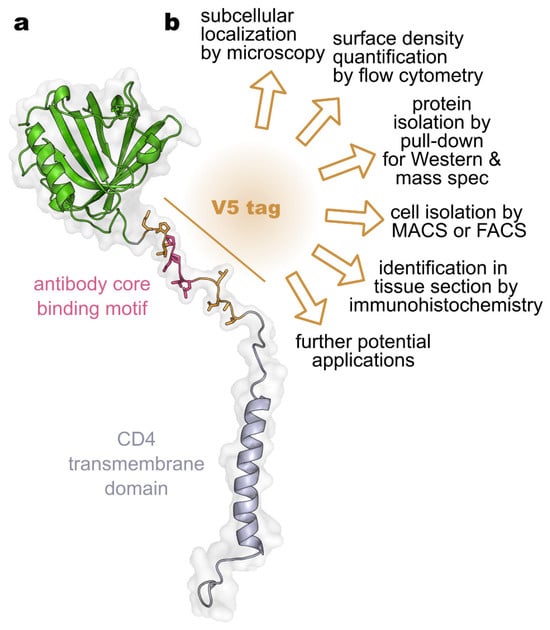 (a) Schematic representation of the V5 tag in the synthetic membrane protein DTPA-R developed for PET imaging [19]. The reporter protein consists of an Anticalin (green) binding CHX-A″-DTPA•metal chelates, an extracellular linker containing the V5-epitope tag (ochre, core motif in purple), and the CD4 transmembrane domain. (b) Potential use cases for the V5 tag.
