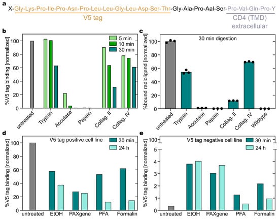 However, cell or tissue processing, like enzymatic digest or fixation, may affect the epitope tag and limit its utility. In particular, extracellularly exposed proteins might be enzymatically cleaved upon cell detachment or masked by the fixation chemistry, thus resulting in lowered signals or even false negative results. As demonstrated in this study, the V5 tag proved to be resistant to trypsin, as expected from its sequence, which lacks arginine residues and exhibits only one lysine residue preceding the imino acid proline, thus constituting a poor substrate for this protease. On the other hand, the V5 tag is susceptible to cleavage by other common enzymes. For comparison, the Flag-tag, Strep-tag II, myc-tag, AU1-tag, E-tag, and ALFA-tag all contain cleavable lysine or arginine residues (see Table S1), thus rendering trypsin, the standard protease for cell detachment, problematic for sample preparation. Apart from that, we observed that chemical fixation reduces the recognition of the V5 tag by the mu_SV5Pk1 antibody; however, this effect is well-known for different fixatives and also for other tag systems. Therefore, impaired detection efficiency must be considered in general if cell fixation is required [42,43,44].