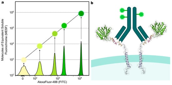 Following the characterization of the cell preparation conditions, we applied the V5 tag to quantify DTPA-R densities (number of receptors per cell) by flow cytometry. Commercial kits based on beads with known quantities of fluorophore (e.g., Bangs Laboratories Quantum MESF kit) can be used to convert fluorescence intensity signals measured upon binding of an antibody with known degree of labelling (DOL) to an absolute number (Figure 3a). However, the assumption of one (bivalent) antibody binding two receptors (Figure 3b) might lead to an overestimation of receptor numbers, especially in the case of low expression levels, which promotes monovalent complex formation. This could be circumvented by using monovalent binders such as the anti-V5 tag nanobody [10], a single-chain variable fragment (scFv) or proteolytic Fab fragment of SV5-Pk1 antibodies. Nevertheless, this method allowed us to quantify the receptor number on CAR-T cells expressing the DTPA-R reporter gene. In particular, ~86,000 copies of DTPA-R were detected using the V5 tag (antibody mu_SV5-Pk1-AF488: DOL 3.8), while ~170,000 copies of CD3 (anti-CD3-AF488: DOL 3.9), ~150,000 copies of CD4 (anti-CD4-AF488: DOL 5.8), and ~17,200 copies of CXCR3 (anti-CXCR3-AF488: DOL 3.9) were detected on the cell surface using commercial receptor-specific antibodies [19].