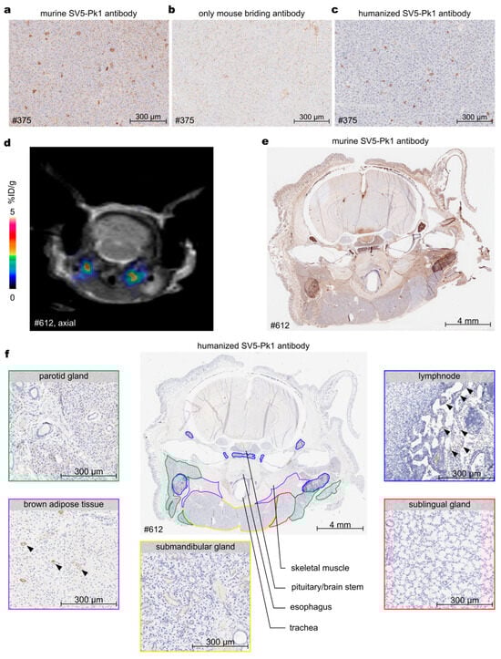 Another example where a low background signal is important became evident when searching within the throat region of a CD-1 nude mouse for tissue that had been transduced by AAV9 viral vectors delivering the DTPA-R gene, thus causing pronounced radioligand enrichment in a PET image (Figure 5d). These clear but localized PET signals could not be assigned to specific anatomic structures using PET/MR and consequently necessitated histological investigation. However, the initially applied mu_SV5-Pk1 antibody produced a high background signal in various tissues (Figure 5e), making reliable interpretation impossible, even for an experienced pathologist. In marked contrast, the new hu_SV5-Pk1 antibody in combination with the rabbit anti-human bridging antibody did not cause such background signals (Figure 5f). In the region of interest, different glands and tissues were annotated, and V5 tag staining was identified in the brown adipose tissue (BAT) (Figure 5f). Also, positive staining on a small fraction of individual cells in the lymph nodes and the parotid gland as well as a slight positive cytoplasmic staining for the majority of ducts in the submandibular gland was detected.