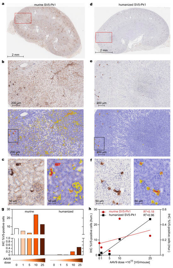 Quantification of AAV9DTPA-R transduced cells in kidneys of C57BL/6 mice. (a–f) Kidney section of mouse #755 (highest titre, 2.5 × 1012 vg/mouse) stained with (a–c) mu_SV5-Pk1 and rabbit anti-mouse bridging antibody or (d–f) the hu_SV5-Pk1 and rabbit anti-human bridging antibody. (a,d) Whole kidney section and (b,c,e,f) magnification and corresponding quantification of percent positive cells using QuPath with low (yellow, threshold = 0.2), medium (orange, threshold = 0.4), and high (red, threshold = 0.6) threshold segmentation. (g) Quantification of the percentage of V5 tag positive cells by QuPath using all positive cells (threshold = 0.2) in the whole kidney section for tissues stained with mu_SV5-Pk1 or hu_SV5-Pk1 and (h) correlation with the AAV9DTPA-R dose applied.