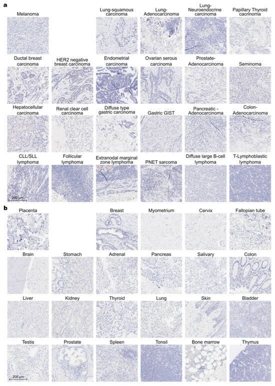 Specificity evaluation of the anti-V5 tag antibody on tissue microarrays. Commercially available tissue microarrays with (a) human cancer tissue and (b) human normal tissue were stained with the mu_SV5-Pk1 and rabbit anti-mouse bridging antibody, showing no specific staining of SV5-Pk1, indicating the absence of unspecific binding by the antibody.