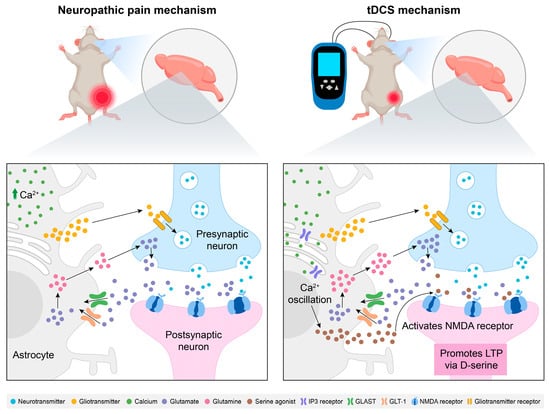 It is hypothesized that tDCS may additionally facilitate long-term potentiation (LTP) through NMDAR pathway modulation via glial activation, enhancing motor cortical neuronal excitability. In humans, tDCS over the motor cortex increases cortical excitability in an NMDAR-dependent manner [62]. Similarly, animal studies have shown that tDCS enhances synaptic responses in motor cortical slices, requiring NMDAR activation and BDNF signaling [63]. Studies have shown that astrocytes are critical mediators of NMDAR-dependent plasticity, primarily through the secretion of synaptogenic signaling molecules via gliotransmission [64,65,66,67]. Although the precise mechanisms of gliotransmission remain debated, the evidence suggests a link to elevated intracellular Ca2+ levels [68,69]. Calcium imaging studies further identified astrocytes as the primary cellular substrate for tDCS-induced cortical Ca2+ surges, with the Ca2+/inositol trisphosphate (IP3) signaling pathway playing a critical role in these elevations [70]. Given the positive correlation between astrocytic Ca2+ levels and extracellular levels of D-serine (an NMDAR co-agonist), it is hypothesized that tDCS enhances NMDAR-dependent synaptic plasticity via astrocyte-specific Ca2+/IP3 pathway activation by serine agonists. This mechanism not only supports gliotransmission but also holds therapeutic potential for attenuating NP-associated allodynia and hyperalgesia.