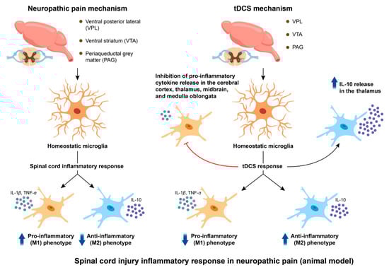 Emerging evidence suggests that tDCS may attenuate spinal neuroinflammation as a therapeutic strategy for NP after spinal cord injury. The data showed that tDCS decreased the spinal cord levels of IL-1 that had been elevated by the CCI model and successfully alleviated the nociceptive behavior until at least seven days after the treatment’s conclusion [84]. Furthermore, studies have revealed that TNF-alpha production in the spinal cord can be decreased by tDCS. The inflammatory reaction in the spinal cord may be suppressed and NP may be relieved by reducing the production of these cytokines [10]. However, a previous study has shown that tDCS altered microglial activation, thereby suppressing spinal inflammatory responses [85]. We speculate that the observed suppression of elevated pro-inflammatory factor levels appears to be associated with phenotypic transformation of microglia. A study investigated the effects of tDCS on neuropathic pain induced by spinal cord injuries, and significant improvements were noted in the thermal stimulation threshold and motor function of rats following tDCS treatment compared to the control group. Notably, it was observed that tDCS reduced the proportion of the M1 phenotype of microglia within the VPL, VTA, and PAG regions, while increasing the proportion of the M2 phenotype [83]. tDCS effectively reduced the concentrations of pro-inflammatory cytokines in the cortex, thalamus, midbrain, and medulla, while increasing the concentration of the anti-inflammatory cytokine IL-10 in the thalamus. Previous studies have shown that M1 phenotype microglial cells can transition to the M2 phenotype [86]. It is speculated that under tDCS stimulation, the polarization of microglia toward the M1 phenotype is suppressed in the aforementioned brain regions, while polarization toward the M2 phenotype is promoted. By inhibiting the release of pro-inflammatory cytokines such as IL-1 and TNF-α from M1 phenotype microglia, inflammation is reduced and pain is alleviated, whereas the transformed M2 phenotype microglia enhance the inhibitory effects on pro-inflammatory responses through the release of IL-10, thus achieving anti-inflammatory effects and pain relief. Overall, the methods through which tDCS controls the inflammatory response in the spinal cord during the treatment of NP are intricate and varied. However, current evidence supporting the efficacy of tDCS in treating chronic NP associated with spinal cord injury remains limited [87]. Robust clinical and mechanistic investigations are required to validate tDCS-mediated anti-inflammatory effects on NP symptom management. The schematic diagram illustrating the mechanisms of NP etiology and the therapeutic pathway of tDCS in relation to spinal cord inflammation is presented in Figure 3.