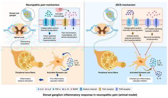In spinal circuits, prior studies have confirmed that glial cell-derived BDNF drives neuronal hyperexcitability by sensitizing primary afferents, a mechanism implicated in NP pathogenesis [103]. Research reported that elevated BDNF levels in DRG neurons correlate with increased spinal dorsal horn BDNF levels in inflammatory pain models [95,104]. Notably, tDCS has been shown to reverse the spinal BDNF elevation, alleviating mechanical allodynia and hyperalgesia in rodent models [105]. It is hypothesized that this spinal cord-level effect likely extends downward to the DRG, where it exerts an inhibitory effect on neuronal excitability through BDNF. A proposed mechanism involves the tDCS-mediated modulation of BDNF/TrkB inhibitory signaling cascades extending from the spinal cord to DRGs, though the precise neurobiological pathways remain undefined. A meta-analysis of the role of BDNF in tDCS suggests that tDCS may induce the expression and release of BDNF in the spinal dorsal horn, which binds to its high-affinity receptor, TrkB [106]. This interaction initiates a signaling cascade related to long-term potentiation (LTP), facilitating the reorganization of new synaptic connections through TrkB signaling and thereby promoting the long-term enhancement of cortical neuronal excitability [106]. Further investigations are required to elucidate tDCS-driven BDNF regulation in DRG neuroinflammation and validate its therapeutic potential for NP management. The schematic diagram illustrating the mechanisms of NP etiology and the therapeutic pathway of tDCS in relation to dorsal root ganglion inflammation is presented in Figure 4.
