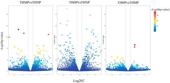 Compared to the control group (THNP), the treatment group with 2 ppm selenium (THMP) exhibited 1144 upregulated DEGs and 1533 downregulated genes. In the comparison between the THNP group and the treatment group with 4 ppm selenium (THHP), 1533 DEGs were upregulated, and 2179 DEGs were downregulated. Between the THMP group and the THHP group, 514 genes were significantly upregulated, and 847 DEGs were significantly downregulated. A large number of significantly DEGs were identified in oysters fed organic selenium-enriched yeast, indicating substantial transcriptomic changes in response to selenium treatment.