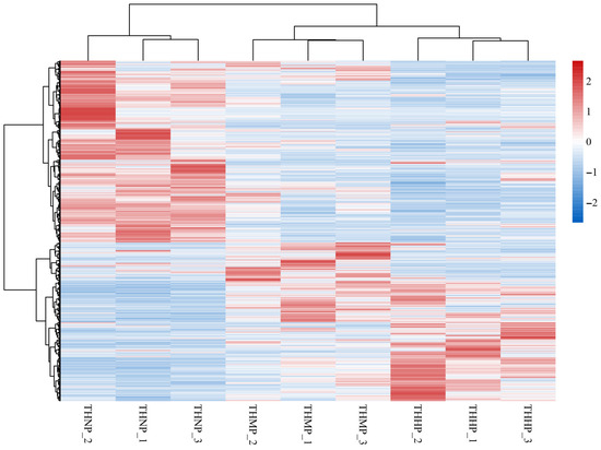 Cluster heatmap of DEG expression in oysters fed with organic selenium-supplemented feed. Horizontally, the heatmap represents different samples, while vertically, it represents various genes. The color transition from red to blue indicates gene expression from high to low.