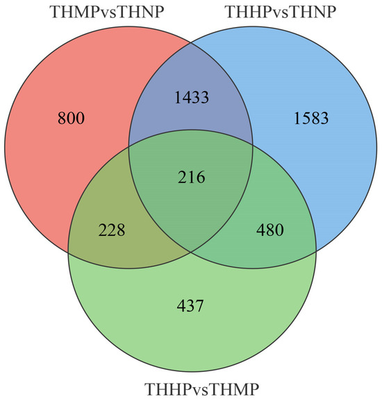 Venn diagram of DEG expression across different comparison groups after feeding with organic selenium. The intersecting areas represent the DEGs that exhibit significant differential expression across the various comparison groups.
