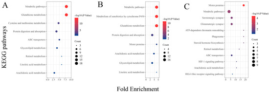 KEGG enrichment analysis of DEGs in different treatment groups of oysters fed with organic selenium. The horizontal axis represents the enrichment factor, and the vertical axis represents different KEGG signaling pathways. (A): KEGG enrichment analysis of DEGs between the treatment group with 2 ppm selenium (THMP) and the control group (THNP); (B): KEGG enrichment analysis of DEGs between the treatment group with 4 ppm selenium (THHP) and the control group (THNP); (C): KEGG enrichment analysis of DEGs between the treatment group with 2 ppm selenium (THMP) and the treatment group with 4 ppm selenium (THHP).