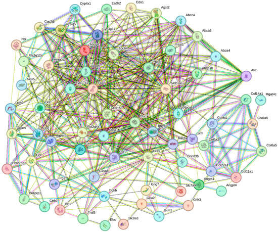 PPI analysis of DEGs involved in the KEGG signaling pathways in oysters after feeding with organic selenium. Each node represents a protein, and the lines between nodes represent interaction relationships.