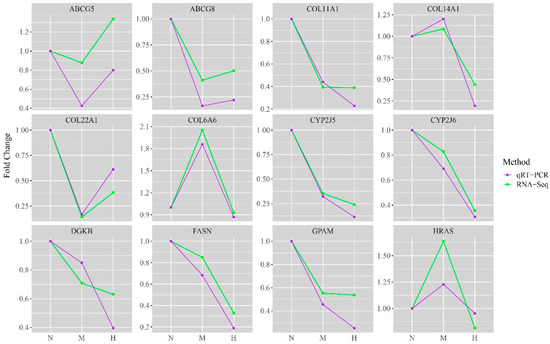 Quantitative validation of RNA-Seq. The expression trend of DEGs consistently proved the accuracy of the sequencing results. The vertical axis indicates the fold difference between treatment groups. The horizontal axis indicates the different groups: N—fold Change between THNP group and THNP group; M—fold Change between THMP group by THNP group; H—fold Change between THHP group and THNP group.