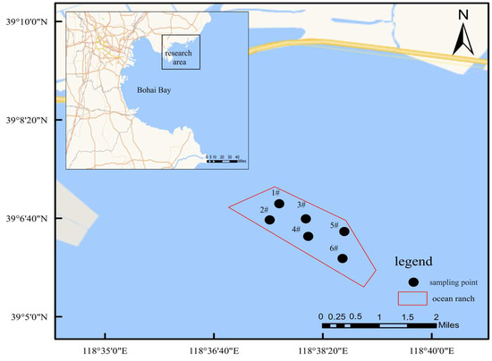 The study’s bottom-seeding marine ranch is situated in the waters near the ecological city of Caofeidian District, Tangshan City. The main construction area is close to the coast, with convenient maritime transportation and well-developed communication infrastructure, which facilitates the breeding and cultivation of marine life and aids in the restoration of the natural marine environment. Considering factors such as the breeding season, fishing moratorium period, growth period, and wintering period, continuous surveys and the monitoring of benthic communities were conducted in the Caofeidian bottom-seeding marine ranch in September and November 2023 and January and May 2024. Six sampling stations were systematically arranged to ensure a uniform spatial distribution across the study area (Figure 1). Both water sampling and macro-benthic collection adhered strictly to the national standard, *Specifications for Oceanographic Survey—Part 6: Marine Biological Survey* (GB/T 12763.6-2007) [19]. In situ water quality parameters, including pH, conductivity, and dissolved oxygen, were measured using a portable multiparameter meter (SX836, Sanxin, Shanghai, China), while salinity was assessed with a salinity meter (ST20S, Ohaus, Shanghai, China). Measurements taken at the monitoring stations encompassed water temperature (WT), pH, dissolved oxygen (DO), and salinity (SAL). Additional water quality parameters were analyzed in the laboratory in accordance with standard procedures, such as those outlined in *Water and Wastewater Monitoring Methods* [20]. The seven water quality parameters assessed included chemical oxygen demand (COD), 5-day biochemical oxygen demand (BOD5), ammonia nitrogen (NH4+-N), nitrate nitrogen (NO3−-N), nitrite nitrogen (NO2−-N), soluble phosphate (PO43−-P), and suspended particulate matter.