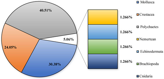Benthic organisms, defined as communities of organisms that inhabit the substrates or sediment–water interfaces in marine and freshwater ecosystems, are a vital component of aquatic ecosystems [8,9]. These organisms are critical in the biogeochemical cycles and energy transfer within aquatic food webs. Based on five vital biological attributes, benthic organisms have been identified as important biological indicators for monitoring aquatic environments. Notably, they exhibit high environmental sensitivity to ecological disturbances, limited mobility with a narrow dispersal range, distinct taxonomic features, longer life cycles and the unique ability to retain specific ecological memories of their habitats as environmental archives. In 2000, Borja et al. introduced the AMBI (AZTI Marine Biodiversity Index), which measures the disturbance induced by human activities by quantifying the ratio of sensitive to tolerant species [10]. These biological characteristics enable a broad range of applications in biological monitoring projects and water quality assessment programs [11,12,13]. In recent years, large benthic organisms have become crucial biological indicators for assessing anthropogenic disturbances and are extensively leveraged in the environmental monitoring of estuarine and coastal ecosystems [14,15,16,17].