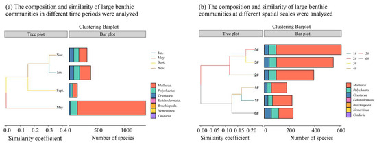 The composition and similarity of large benthic communities at different spatial scales were analyzed. Note: (a) Analysis of species composition and similarity of large benthic organisms under time change, (b) Analysis of species composition and similarity of large benthic organisms at spatial scale.
