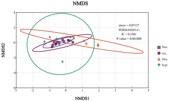 The NMDS algorithm was used to study the similarity or difference in the composition of large benthic communities, and PERMANOVA (Adonis) was used for testing and identification. A nonparametric multivariate analysis of variance was used for sample distance (Bray–Curtis) [34].