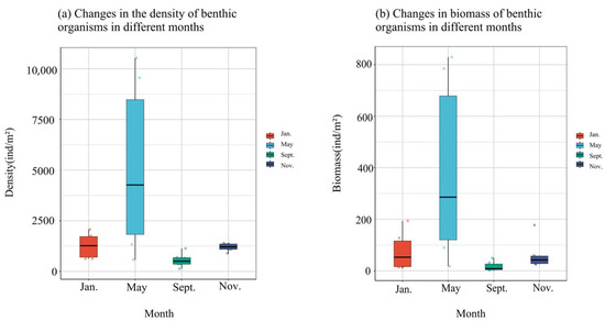 The species composition within the monitored area predominantly consists of mollusks, polychaetes, and crustaceans. As illustrated in Figure 3a, the seasonal variations in the macro-benthic community observed in this study are primarily reflected in changes in density rather than species composition. The Bray–Curtis similarity coefficient reveals that the greatest similarity is observed between the months of November and January. Temporally, the density in May is significantly higher than in the other three months, with Musculus senhousei exhibiting absolute dominance. Conversely, the species density in September is the lowest, potentially attributable to the adverse impact of fishing activities on the benthic habitat within this marine area.