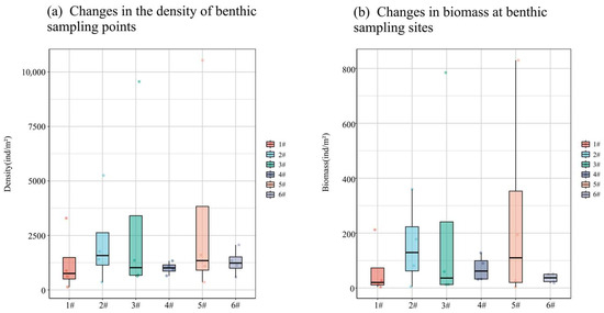 The density and biomass of large benthic organisms, except for points 4 and 6, show a consistent trend with spatial changes. Notably, these indicators peak at point 5, followed by point 3, while they reach their lowest points at points 4 and 6 (Figure 6). Specifically, density and biomass at point 5 are significantly higher than in other months. Conversely, density is the lowest at point 4, and biomass is the lowest at point 6.
