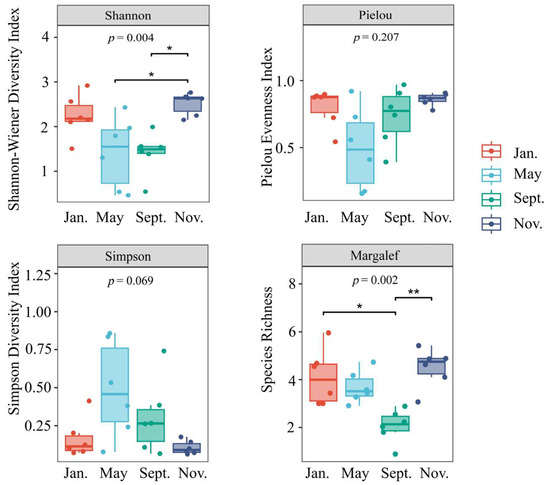 Figure 7 illustrates the biodiversity index of macro-benthos within the bottom-seeded marine ranch located in Caofeidian. The Shannon diversity index, with a significance level of p < 0.01, demonstrates relatively elevated values in November and January while exhibiting lower values in May and September. Notable differences in biodiversity are observed across these four months, potentially attributable to bottom trawling activities in the region. In contrast, the Pielou evenness index displays minimal variation. The Simpson index did not change significantly, with p > 0.05. Furthermore, the Margalef richness index, with a significance level of p < 0.01, is significantly reduced in September relative to the other months.