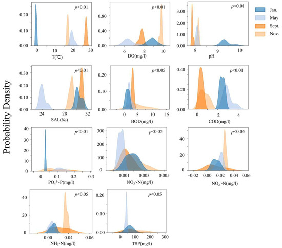 The temporal changes in the environmental factors in the bottom-seeding marine ranch in Caofeidian are shown in Figure 8. The physical and chemical indices of the water environment exhibit obvious characteristics among different survey months, and all the environmental factors show significant seasonal differences (p < 0.05). The chemical oxygen demand (COD) in May is significantly higher than that in other months. The biochemical oxygen demand (BOD) in November is significantly higher than that in other months (p < 0.05). The average values and variances of environmental factors in each month are shown in Table 3. The concentrations of dissolved oxygen, biochemical oxygen demand, nitrate, nitrite, ammonia nitrogen, suspended particulate matter and other ions in November all reach the highest values. The abundance of benthos in May is significantly higher than that in other months. Various ions in the water body are consumed in large quantities, resulting in relatively low levels of ionic indices. Due to the relatively low temperature in January, the concentrations of various ions and the environmental factors of the water body are all at average levels. The temperature is the highest in September, and the concentrations of various ions are at relatively low levels. In September, the temperature reaches its peak, while the concentrations of various ions remain relatively low.